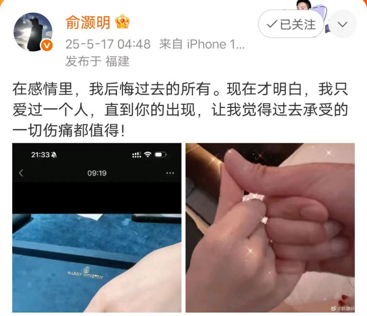 先来瞅瞅俞灏明这波“凡尔赛”操作。他在微博上晒出了钻戒和两只手拉钩的照片,还配上了超甜的文字:“在感情里,我后悔过去的所有。现在才明白,我只爱过一个人,直到你的出现,让我觉得过去承受的一切伤痛都值得!”这不,直接把网友们的少女心都给撩拨得“荡漾”起来了。还有那张照片上的文字:“晨,四个月了,我真的很想很想为你戴上那只真正属于无名指上的钻戒,我爱你,永远……”这甜蜜的氛围,隔着屏幕都能感受到,简直让单身狗们“瑟瑟发抖”。